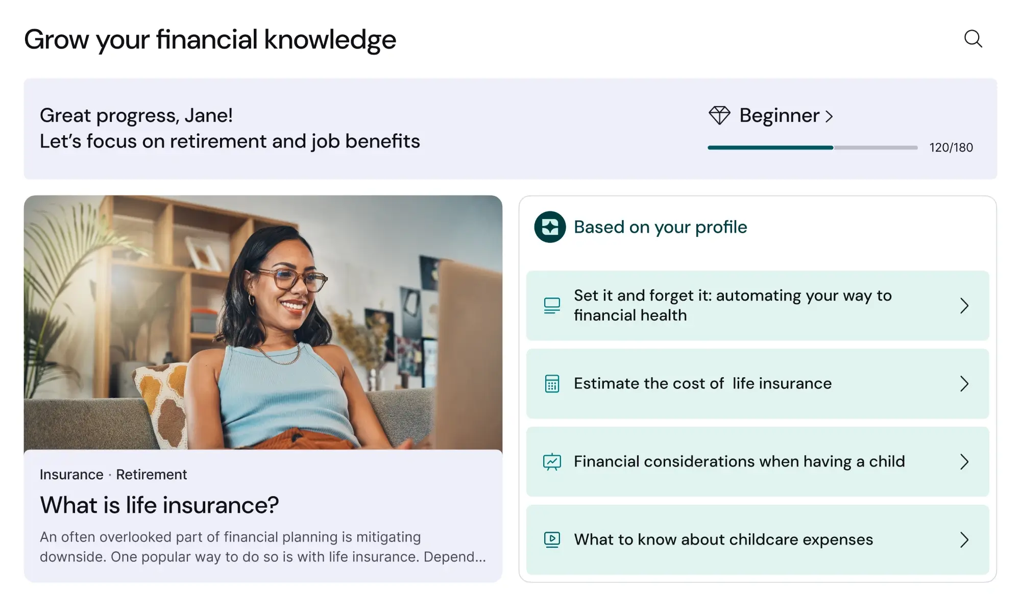 An all-in-one financial learning hub, personalized health assessments, goal-setting and tracking tools, and much more.